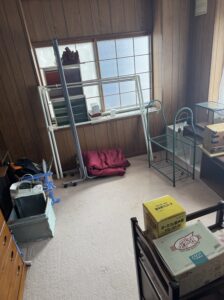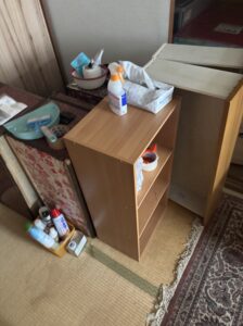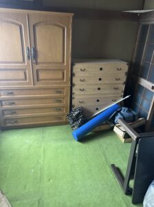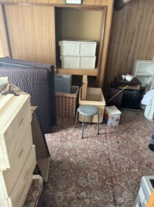 作業前の室内は、大型家具や古い家電製品、段ボールや衣類などが多く残っている状態でした。通路が狭くなり、退去する際に自分たちではどうにもできない状況で「どこから片付けていいかわからない」とお困りのご様子でした。